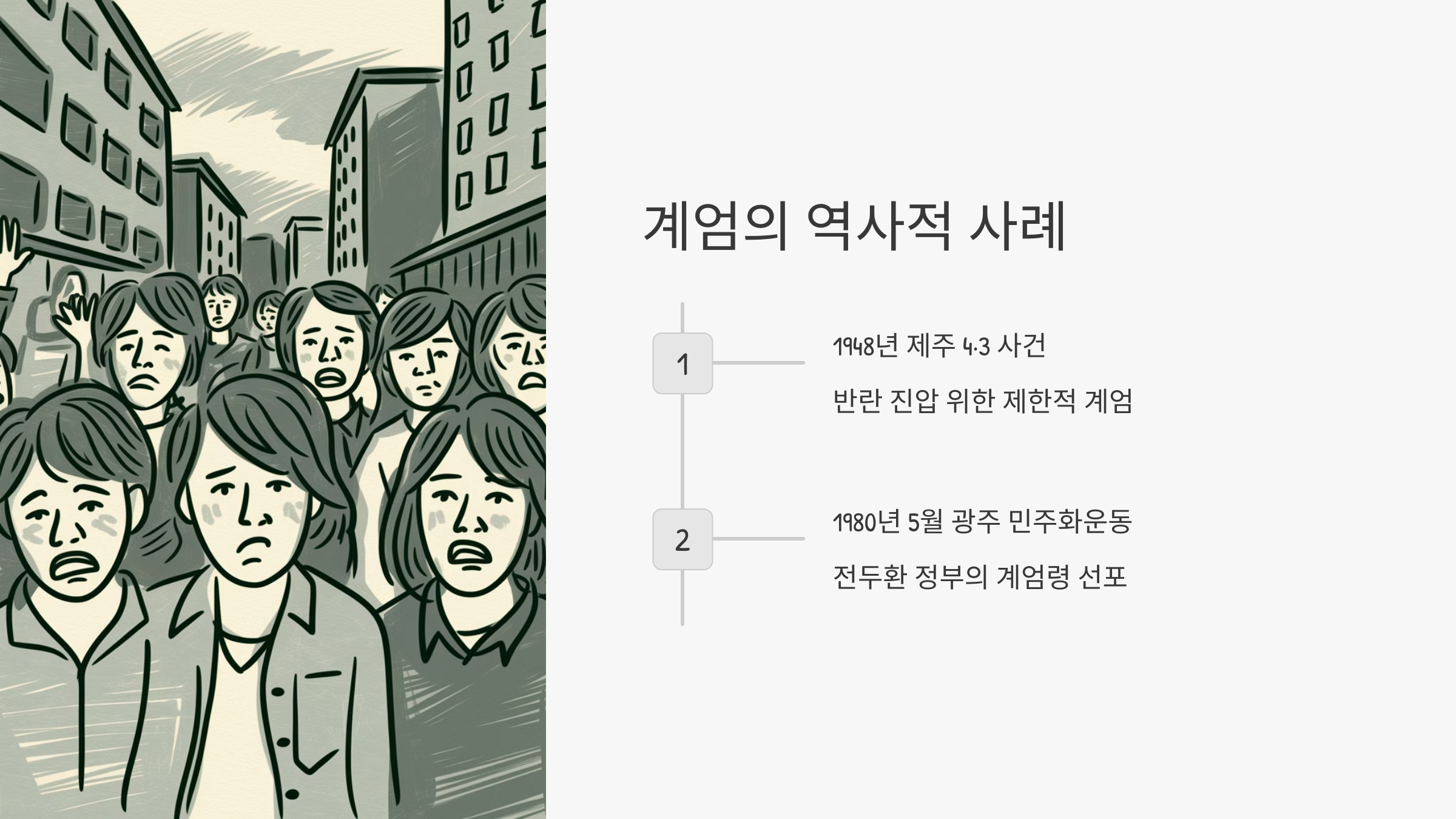- 1980년 5월 광주 민주화운동: 당시 전두환 정부가 계엄령을 선포하며 군대를 투입, 치안 유지 명목으로 폭력 진압이 발생. 이는 계엄 남용의 대표적 사례로 비판받고 있습니다.
