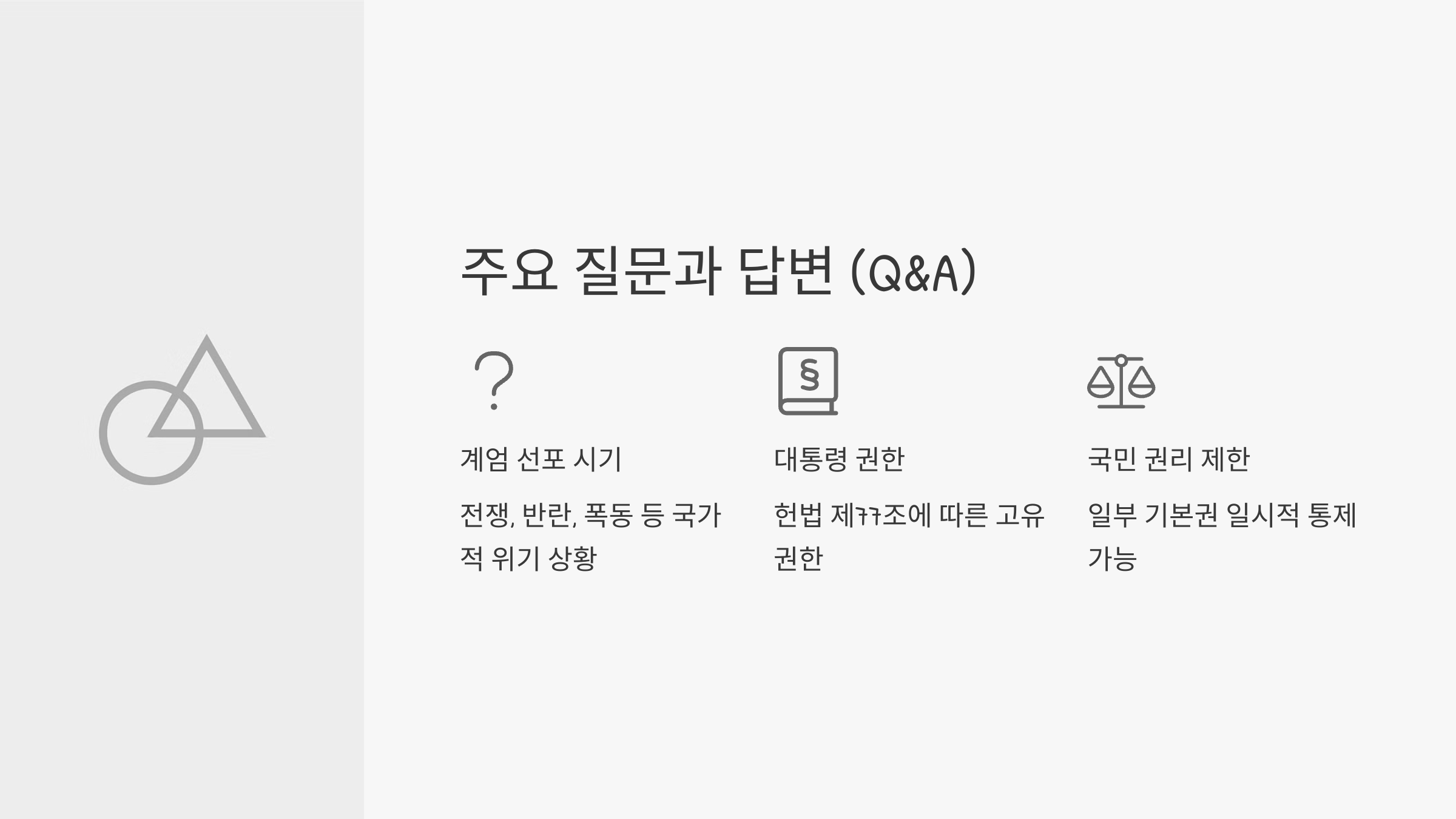 - 계엄 선포는 대통령의 고유 권한이나, 국회의 견제와 승인이 필수적입니다.