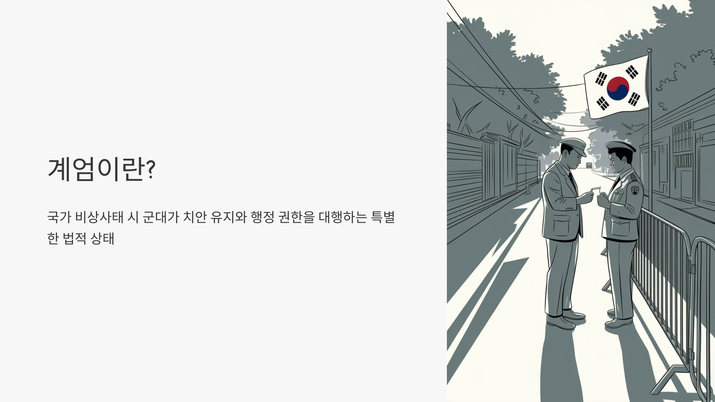 계엄(戒嚴, Martial Law)은 국가 비상사태 시 군대가 치안 유지와 행정 권한을 대행하는 특별한 법적 상태를 말합니다. 계엄은 전쟁, 반란, 폭동, 국가의 치안이 심각하게 위협받는 상황에서 발동되며, 헌법 및 법률에 따라 제한적으로 시행됩니다.