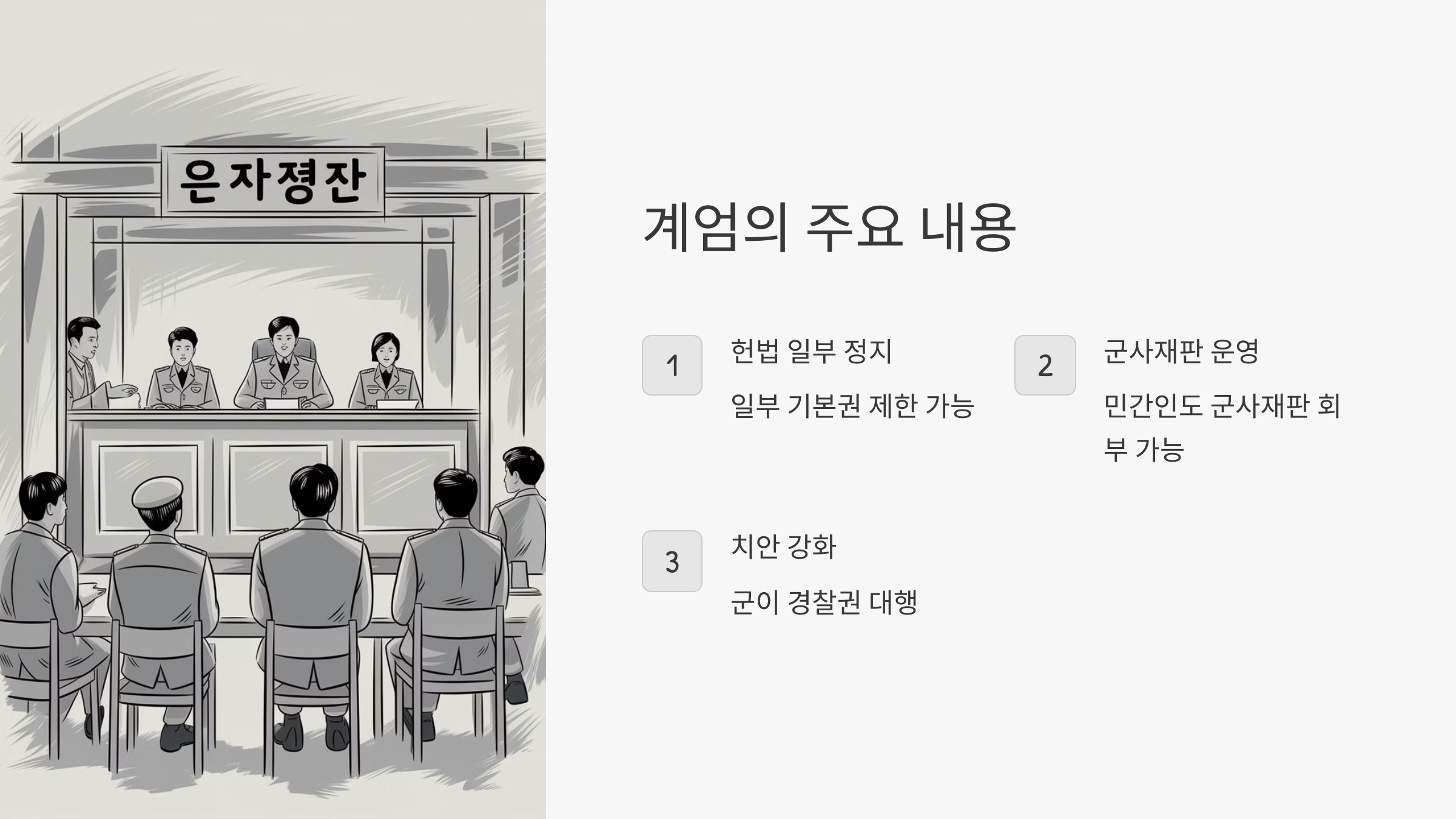 - 군사재판 운영: 계엄이 선포된 지역에서는 민간인이 군사재판에 회부될 수 있습니다.