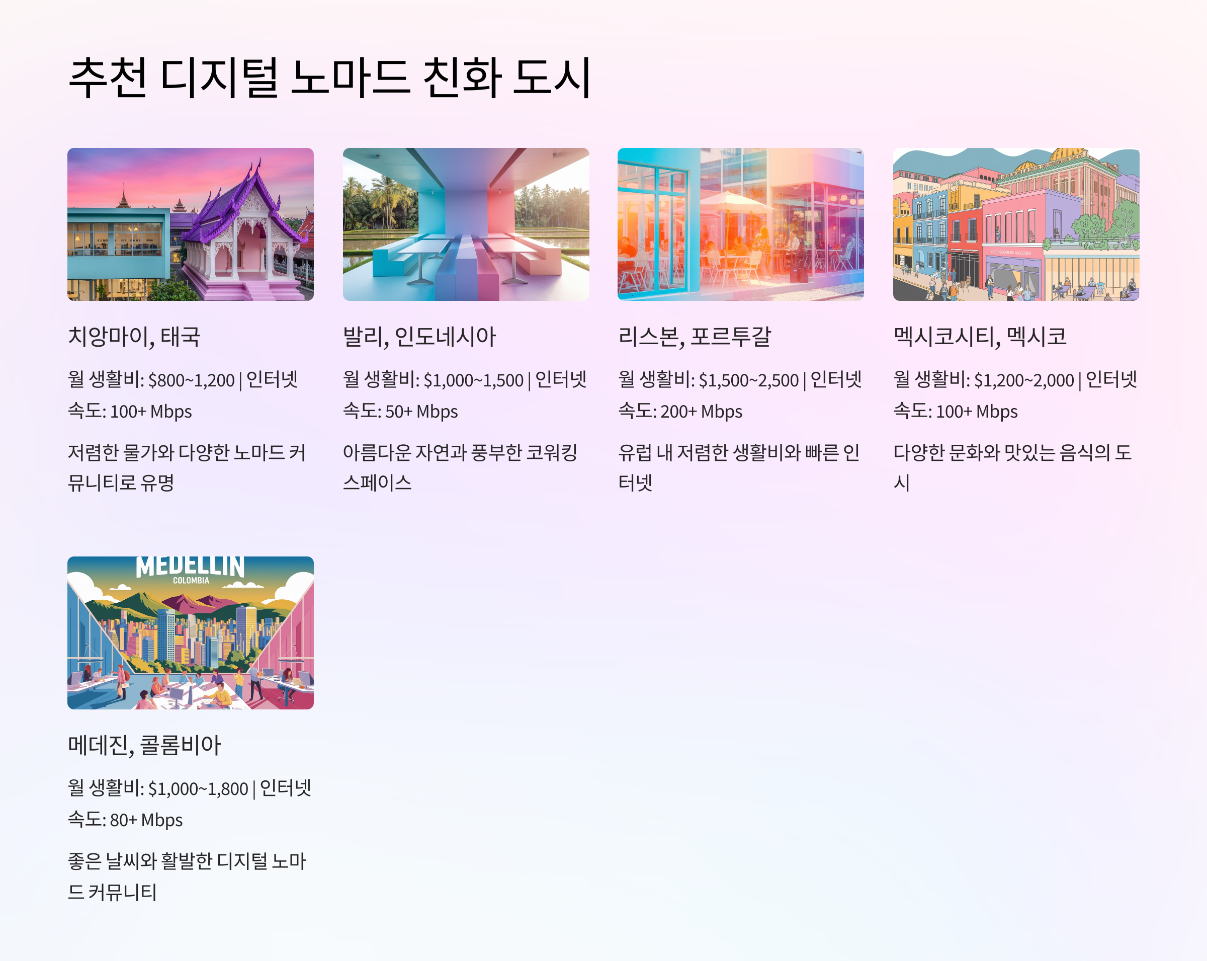 | 메데진 | 콜롬비아 | 1,000~1,800 | 80+ | 좋은 날씨, 활발한 디지털 노마드 커뮤니티 |
