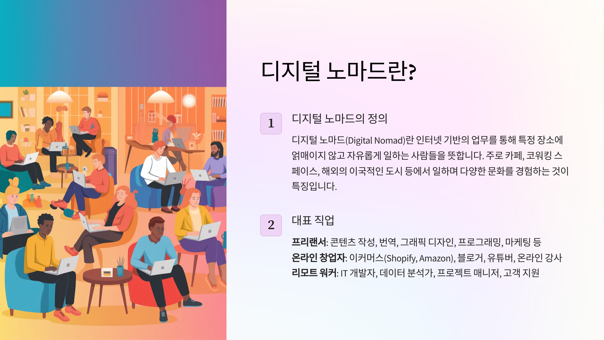디지털 노마드(Digital Nomad)란 인터넷 기반의 업무를 통해 특정 장소에 얽매이지 않고 자유롭게 일하는 사람들을 뜻합니다. 주로 카페, 코워킹 스페이스, 해외의 이국적인 도시 등에서 일하며 다양한 문화를 경험하는 것이 특징입니다.