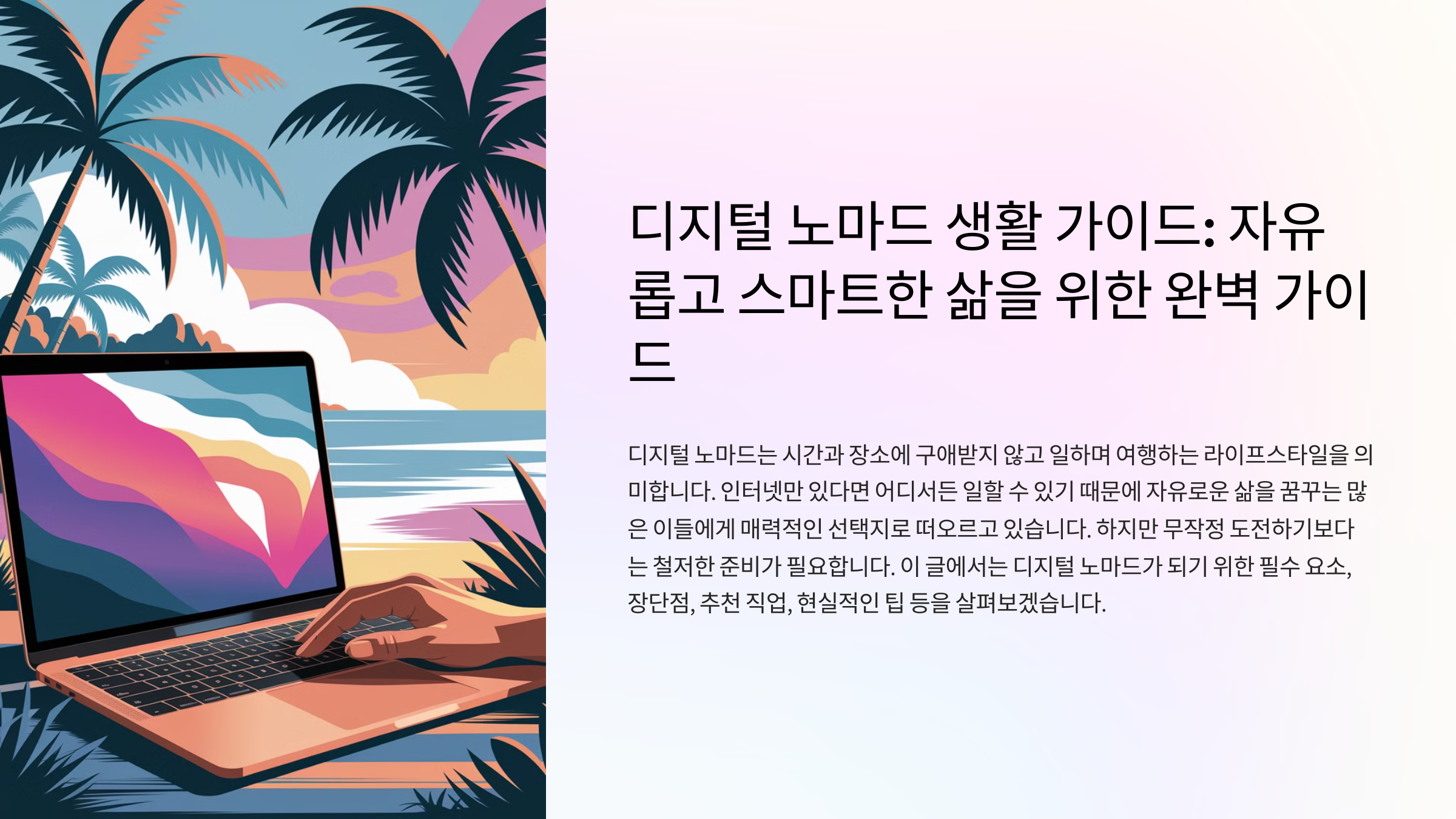 디지털 노마드는 시간과 장소에 구애받지 않고 일하며 여행하는 라이프스타일을 의미합니다. 인터넷만 있다면 어디서든 일할 수 있기 때문에 자유로운 삶을 꿈꾸는 많은 이들에게 매력적인 선택지로 떠오르고 있습니다. 하지만 무작정 도전하기보다는 철저한 준비가 필요합니다. 이 글에서는 디지털 노마드가 되기 위한 필수 요소, 장단점, 추천 직업, 현실적인 팁 등을 살펴보겠습니다.