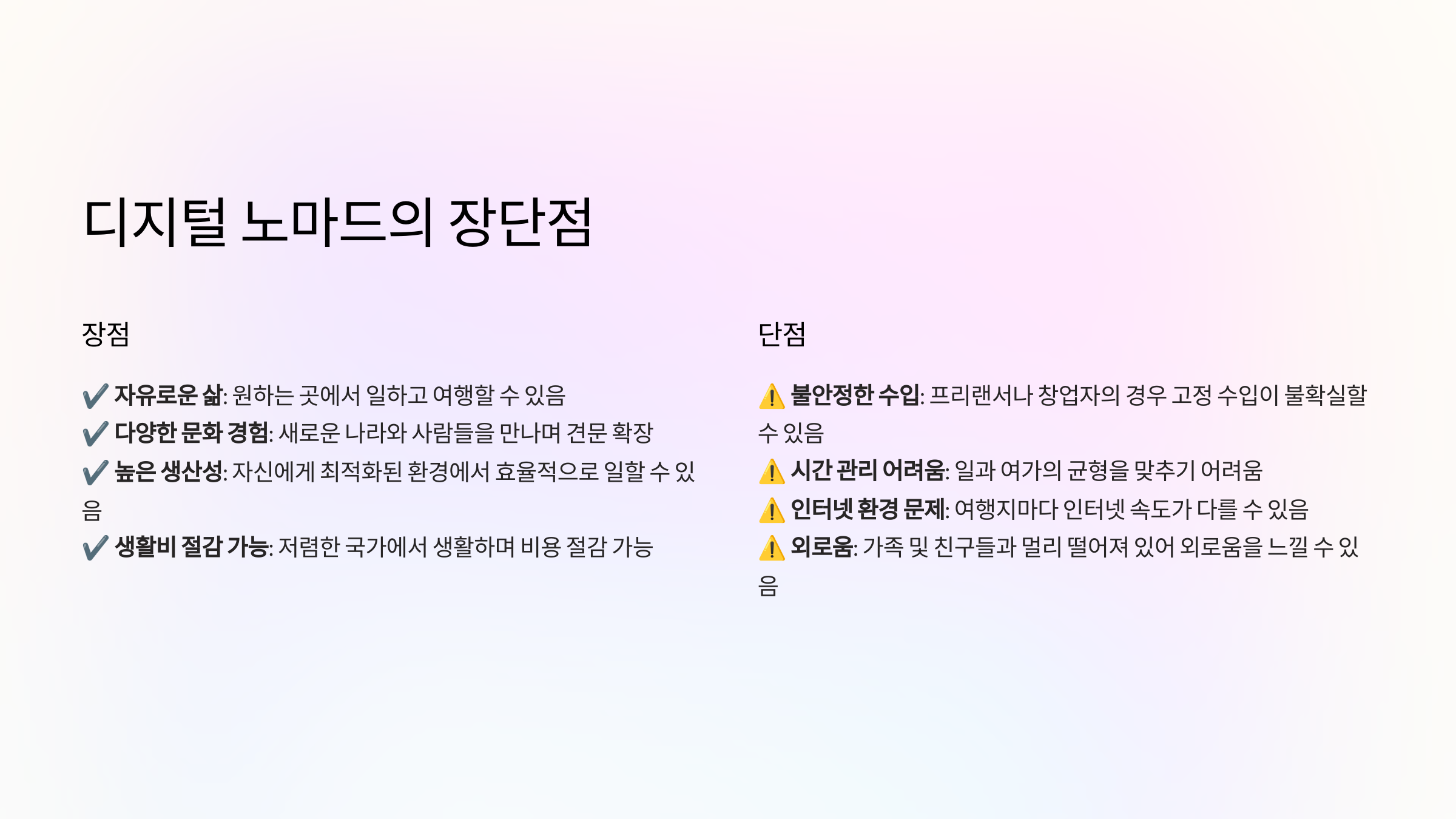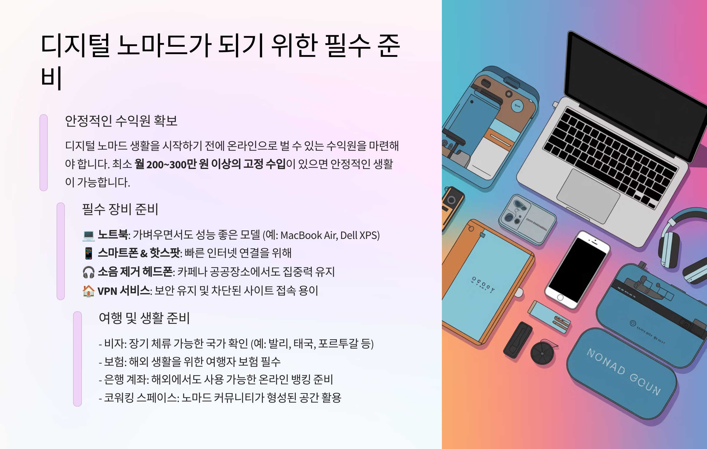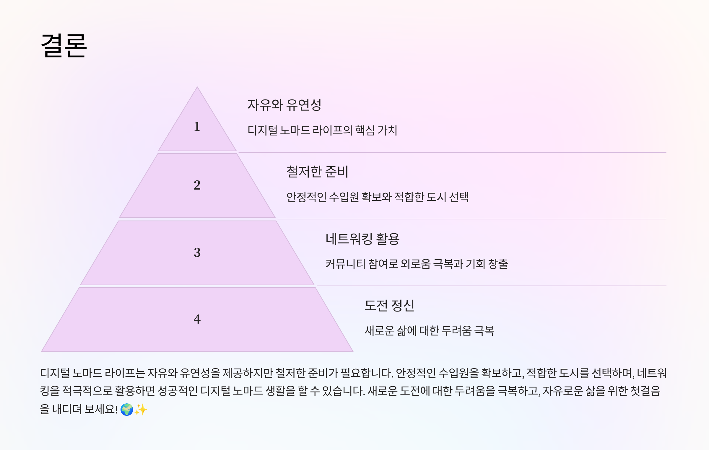디지털 노마드 라이프는 자유와 유연성을 제공하지만 철저한 준비가 필요합니다. 안정적인 수입원을 확보하고, 적합한 도시를 선택하며, 네트워킹을 적극적으로 활용하면 성공적인 디지털 노마드 생활을 할 수 있습니다. 새로운 도전에 대한 두려움을 극복하고, 자유로운 삶을 위한 첫걸음을 내디뎌 보세요! 🌍✨