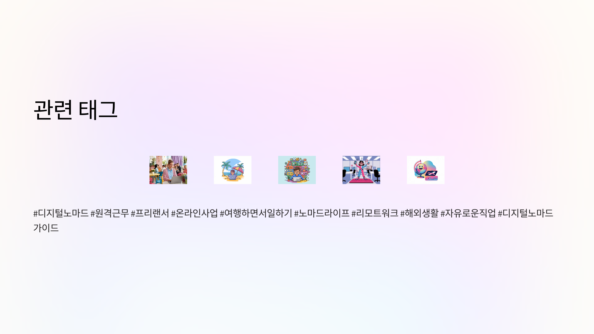 #디지털노마드 #원격근무 #프리랜서 #온라인사업 #여행하면서일하기 #노마드라이프 #리모트워크 #해외생활 #자유로운직업 #디지털노마드가이드 '몸마음 건강' 카테고리의 다른 글