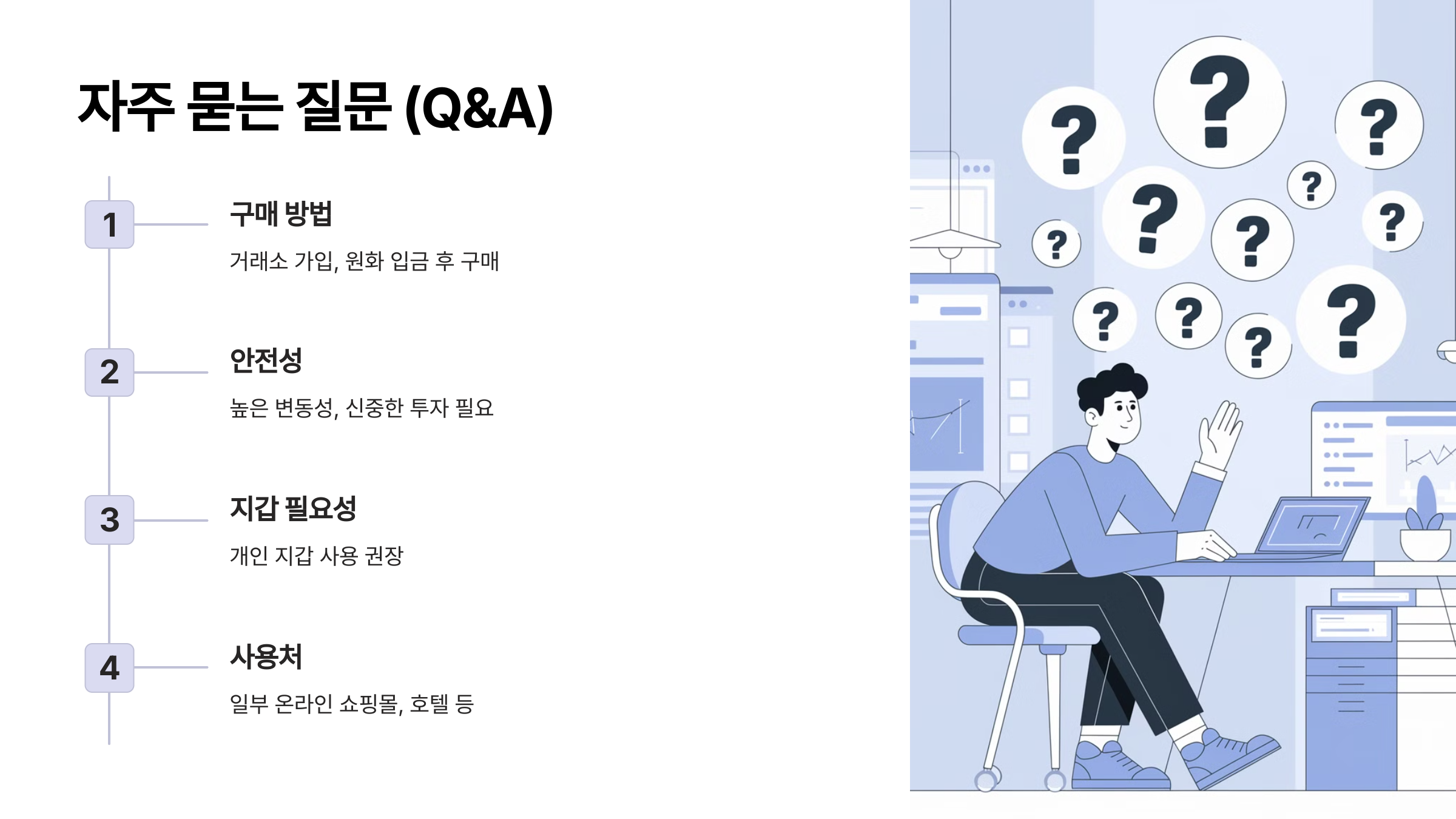 A. 보안을 위해 거래소가 아닌 개인 지갑(콜드월렛, 하드웨어 지갑) 사용이 권장됩니다.