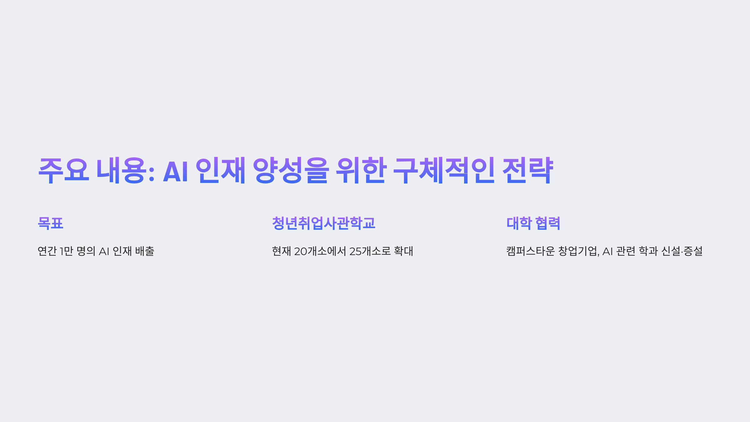 • 연간 1만 명의 AI 인재 배출: 청년취업사관학교와 대학 프로그램 등을 통해 달성할 예정입니다.