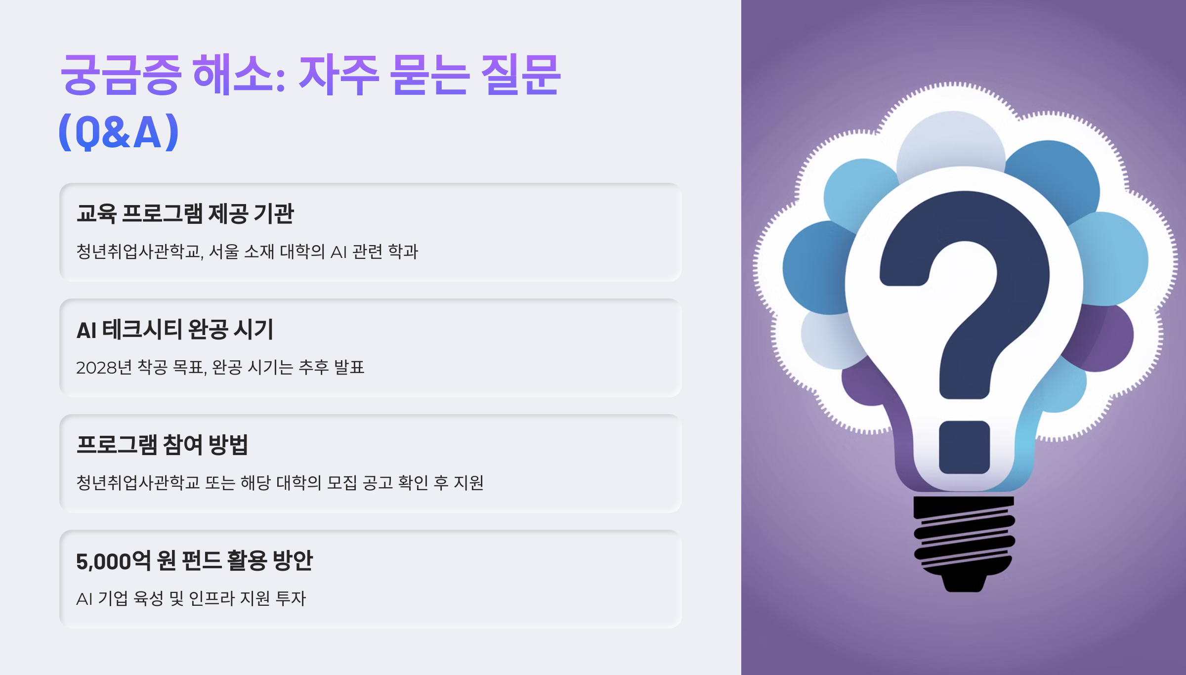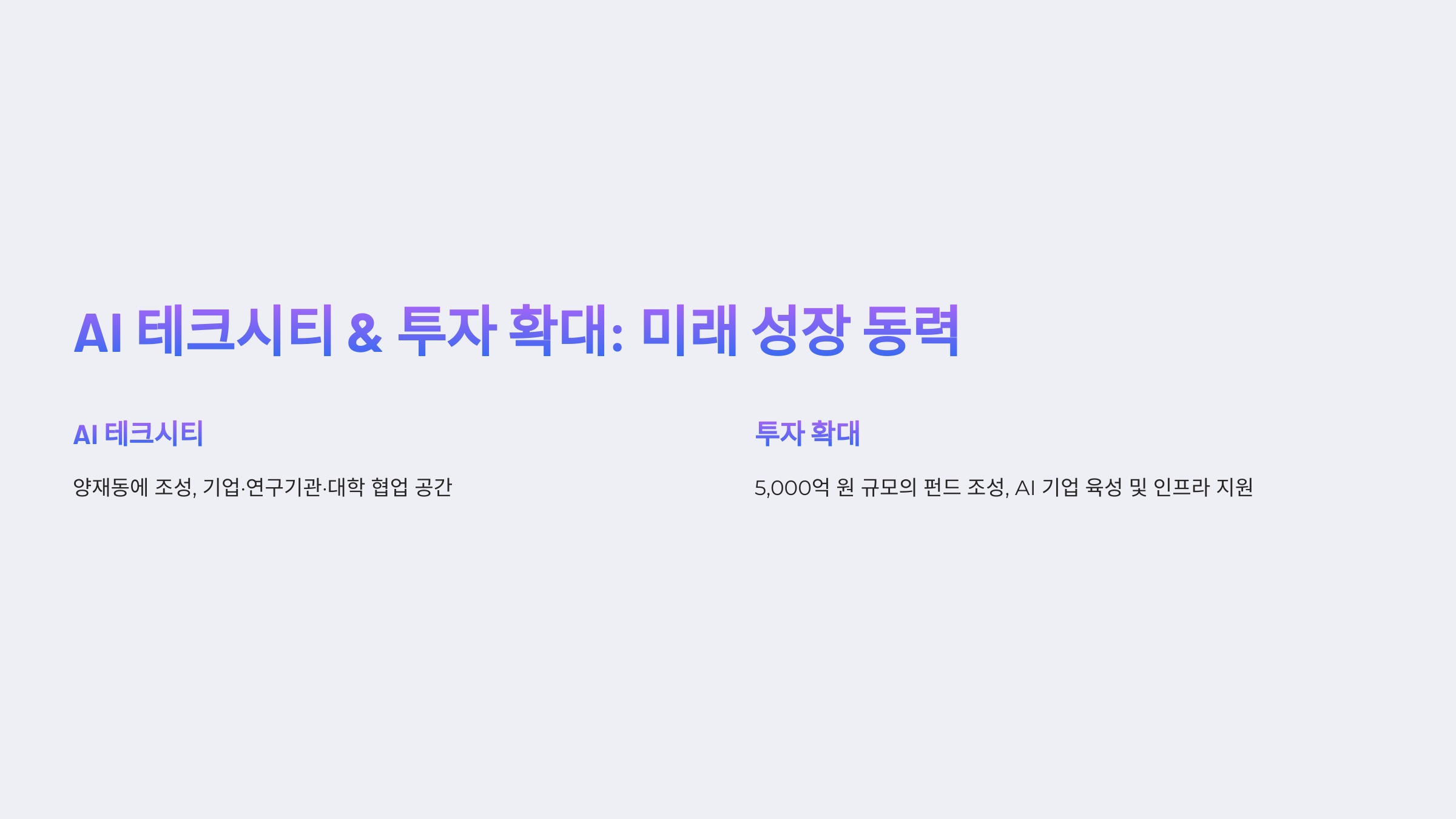 • 양재동에 'AI 테크시티' 조성: 기업, 연구기관, 대학 등이 협업할 수 있는 공간으로, 2028년 착공을 목표로 하고 있습니다.