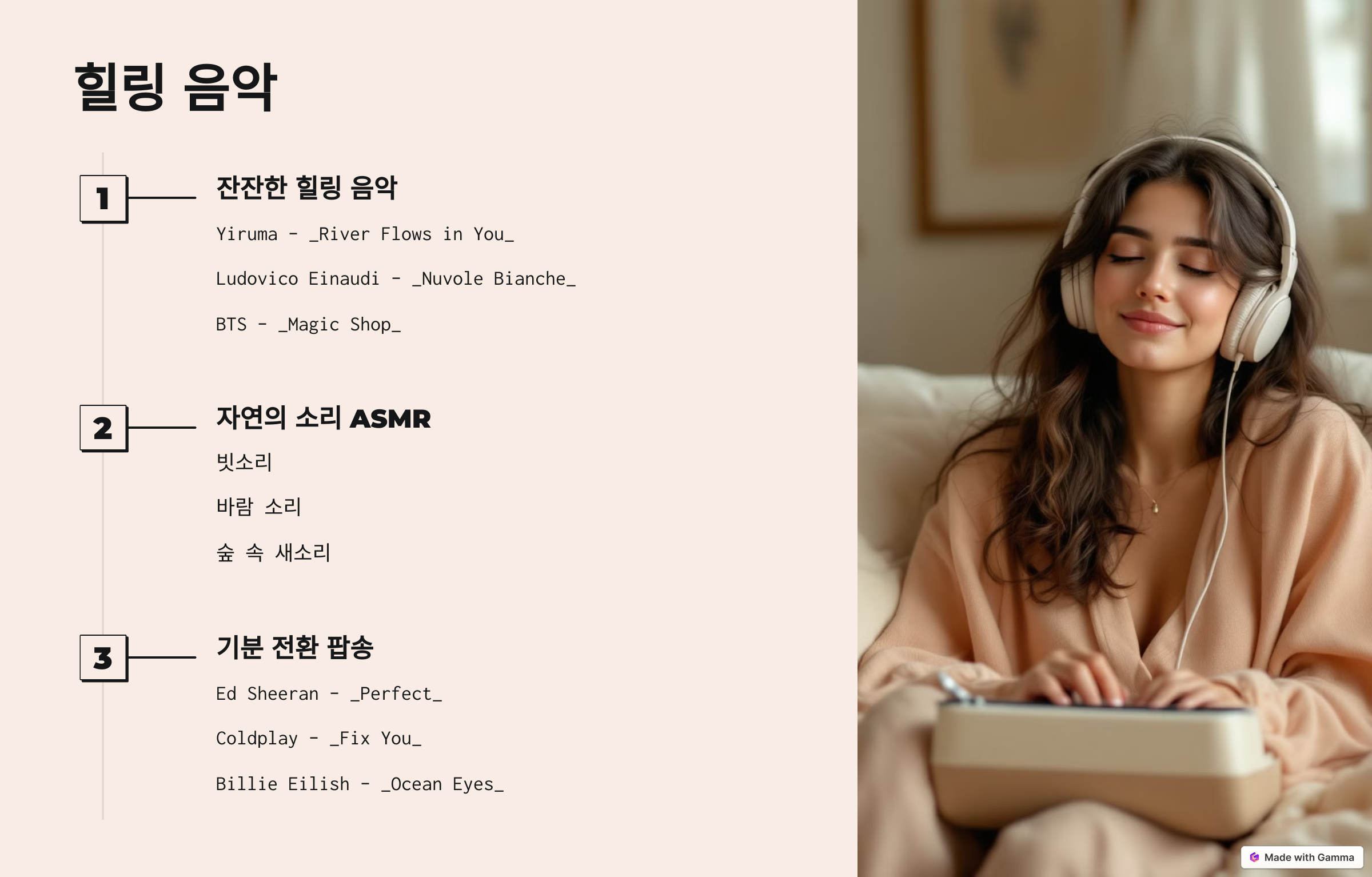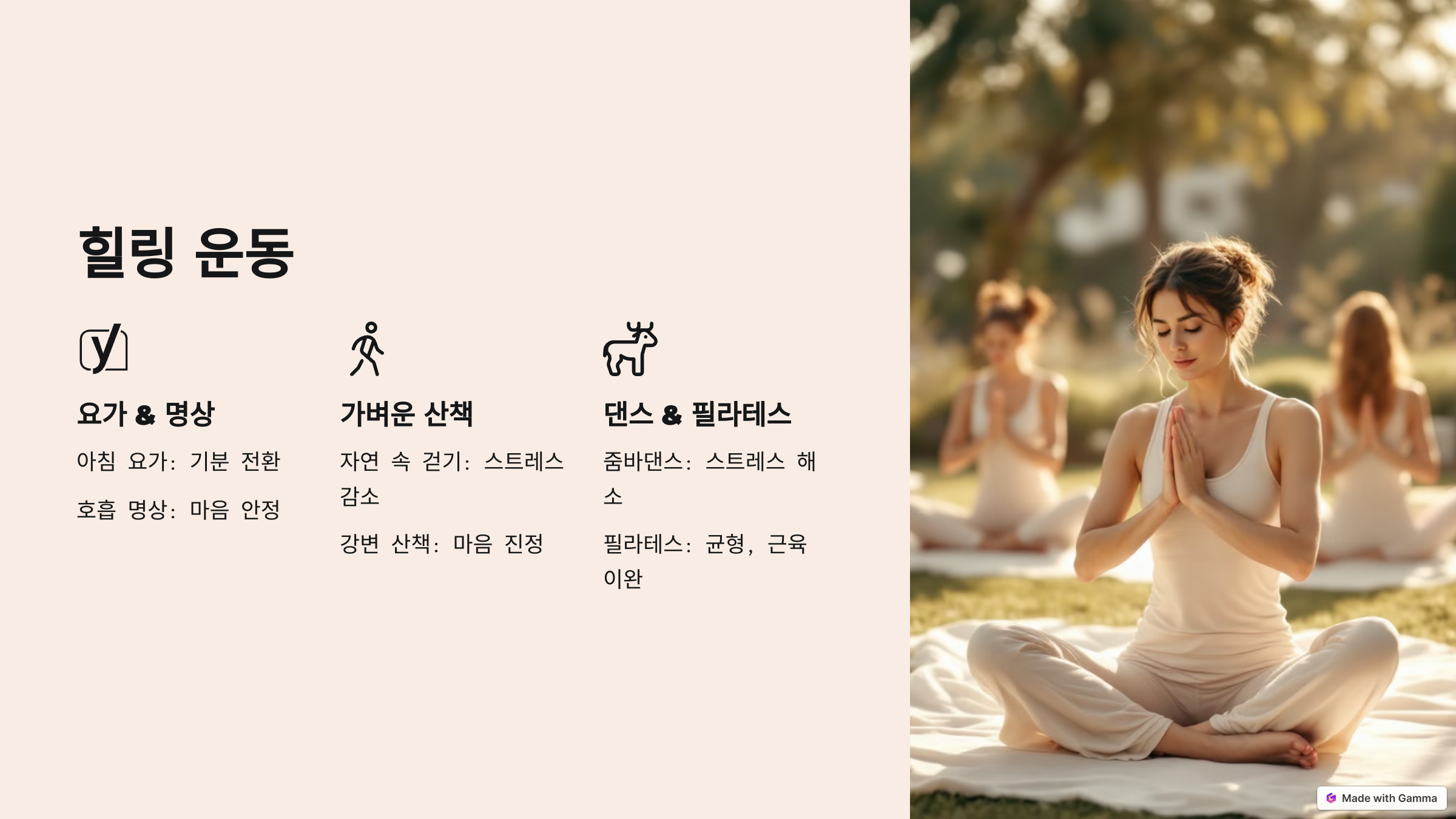 ✅ 짧은 명상(5분), 힐링 음악 듣기, 스트레칭만으로도 효과 있음.