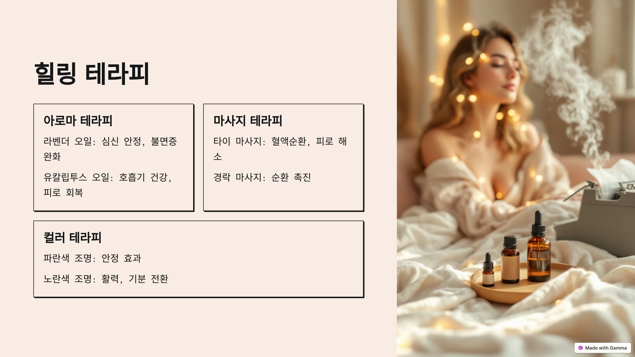 ✅ 마사지 & 스파 – 전문가에게 마사지를 받거나, 홈 마사지기 활용