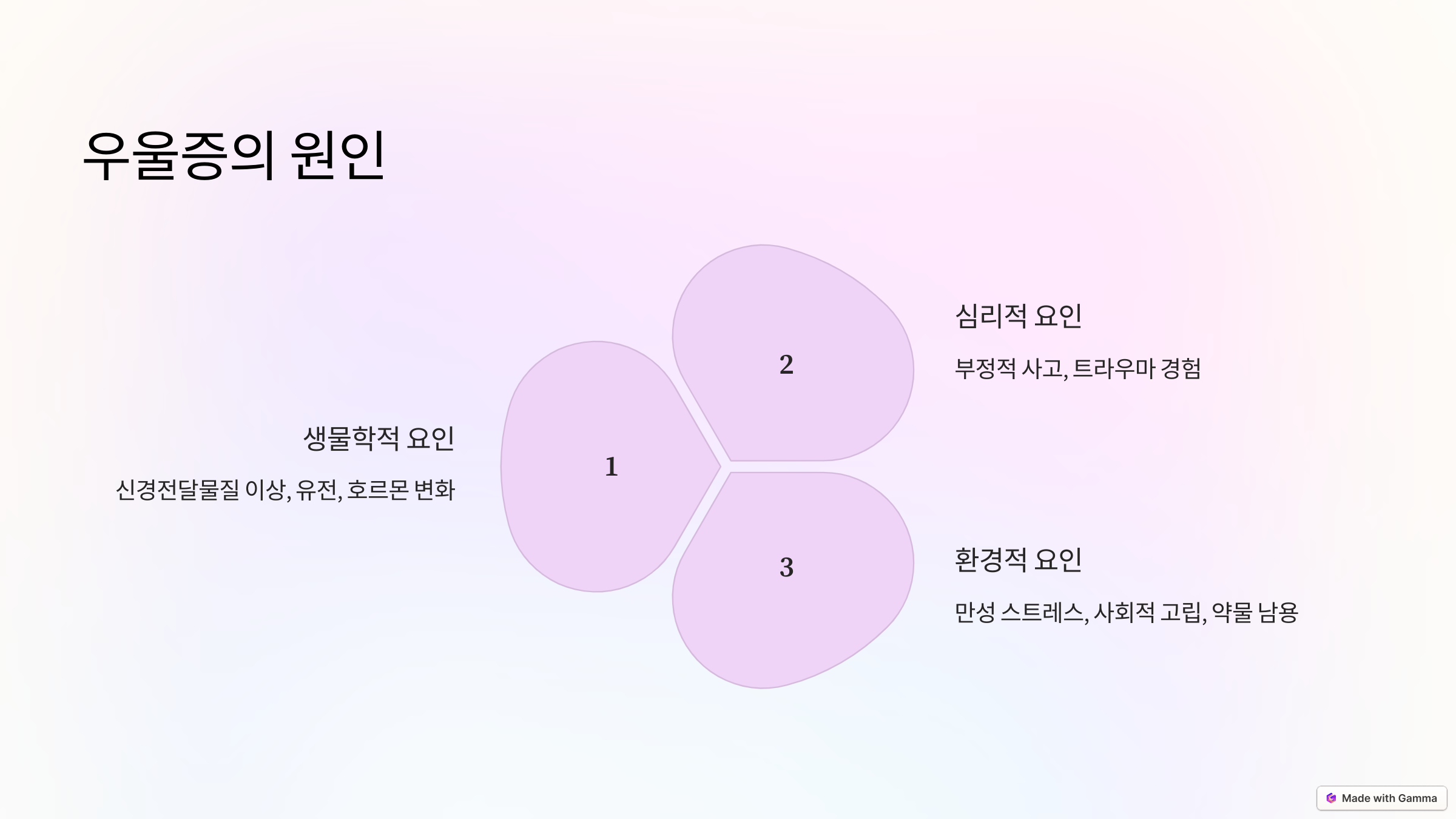 - 유전적 요인: 가족 중 우울증을 앓은 사람이 있을 경우 발병 가능성이 증가함.