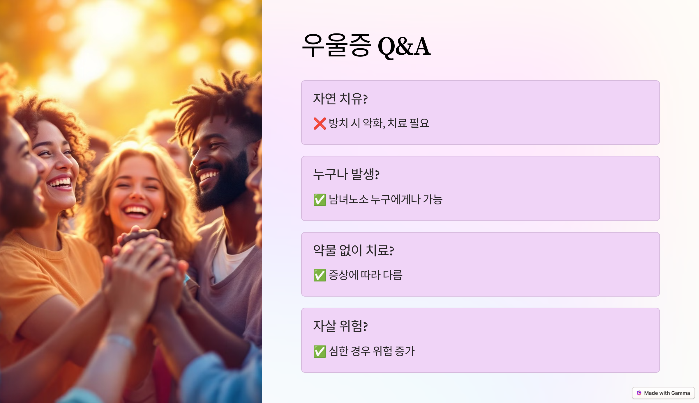 ✅ 심한 경우 자살 위험이 높아질 수 있습니다. 따라서 우울증을 가볍게 여기지 말고 적극적인 치료와 지원이 필요합니다.