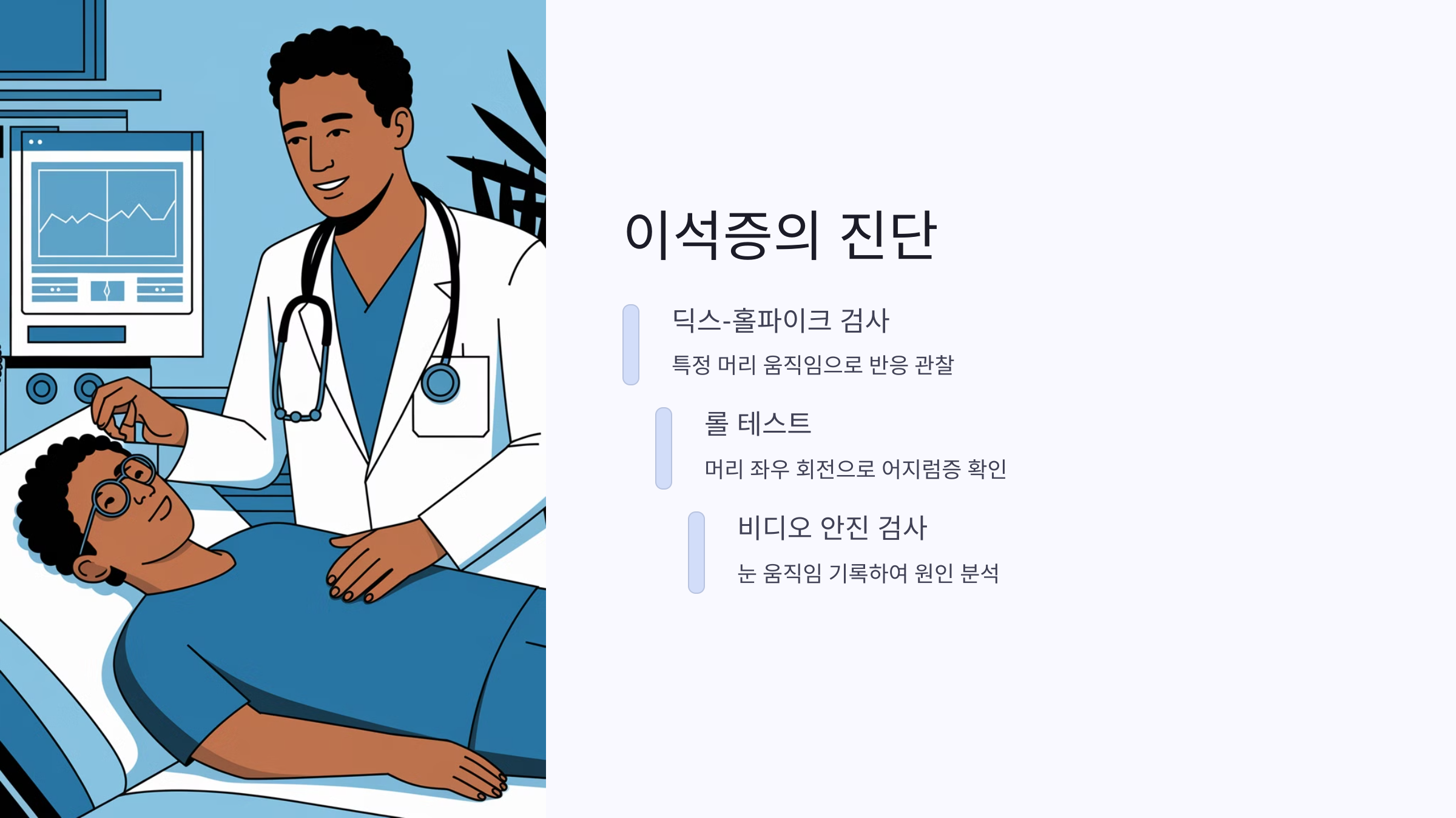 - 머리를 좌우로 회전시키면서 어느 쪽에서 더 강한 어지럼증이 발생하는지 확인