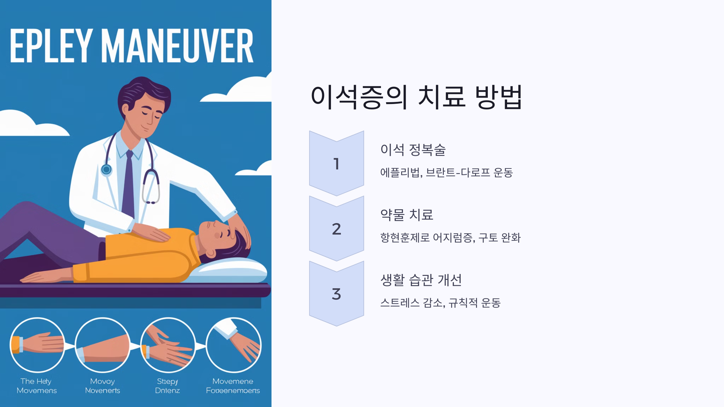 - 에플리(Epley)법: 가장 많이 사용되는 방법으로, 머리를 특정 각도로 움직여 이석을 원래 위치로 되돌리는 방법