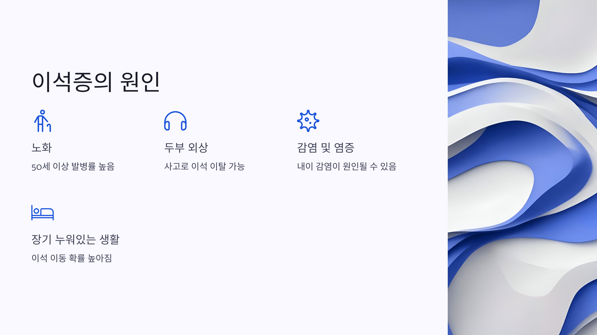- 장기간 누워있는 경우, 이석이 이동하면서 반고리관에 들어갈 확률이 높아집니다.