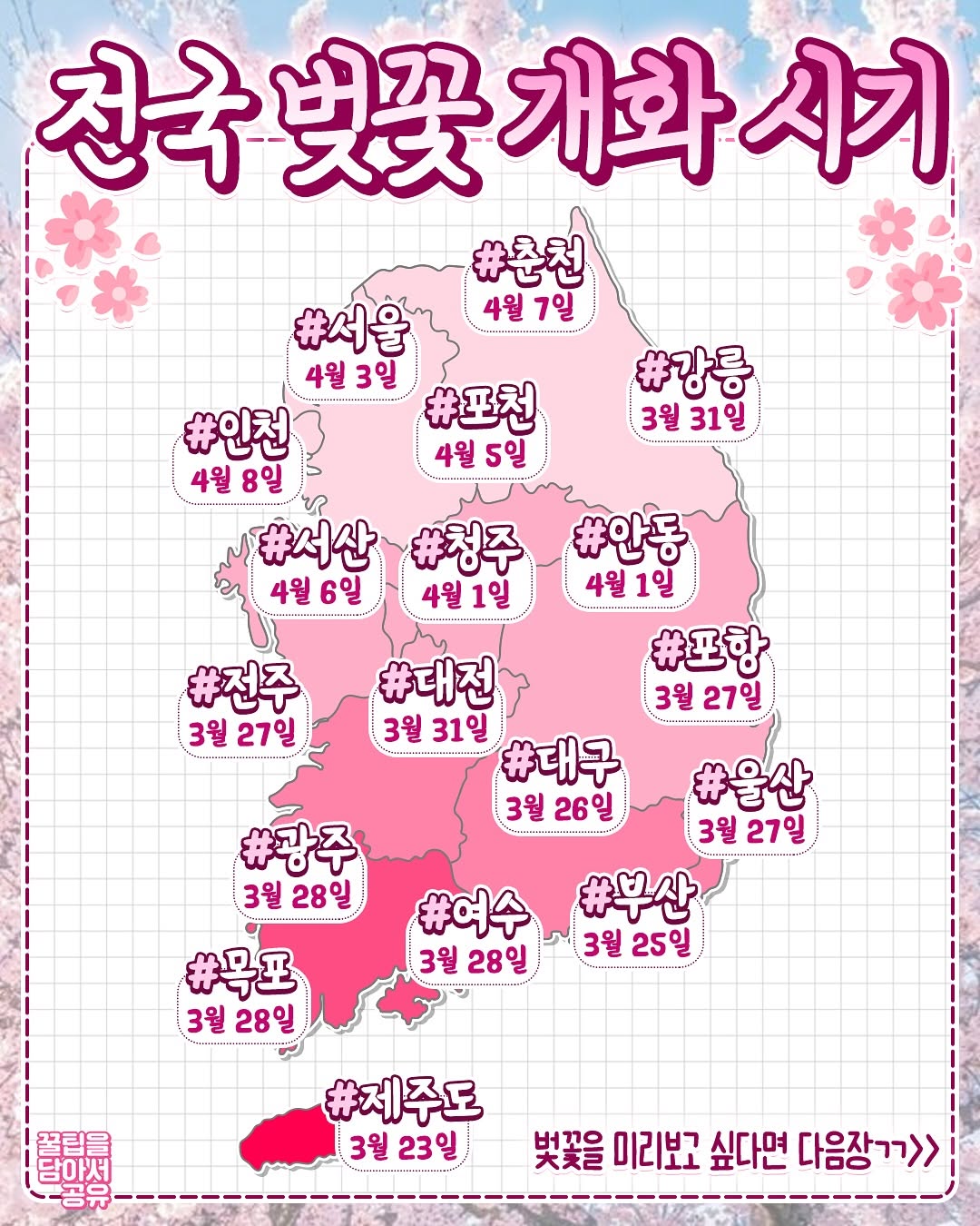 - [2025년 한국 벚꽃 개화시기부터 전국 벚꽃 명소까지!](https://m.post.naver.com/viewer/postView.naver?memberNo=8591454&volumeNo=49553730)