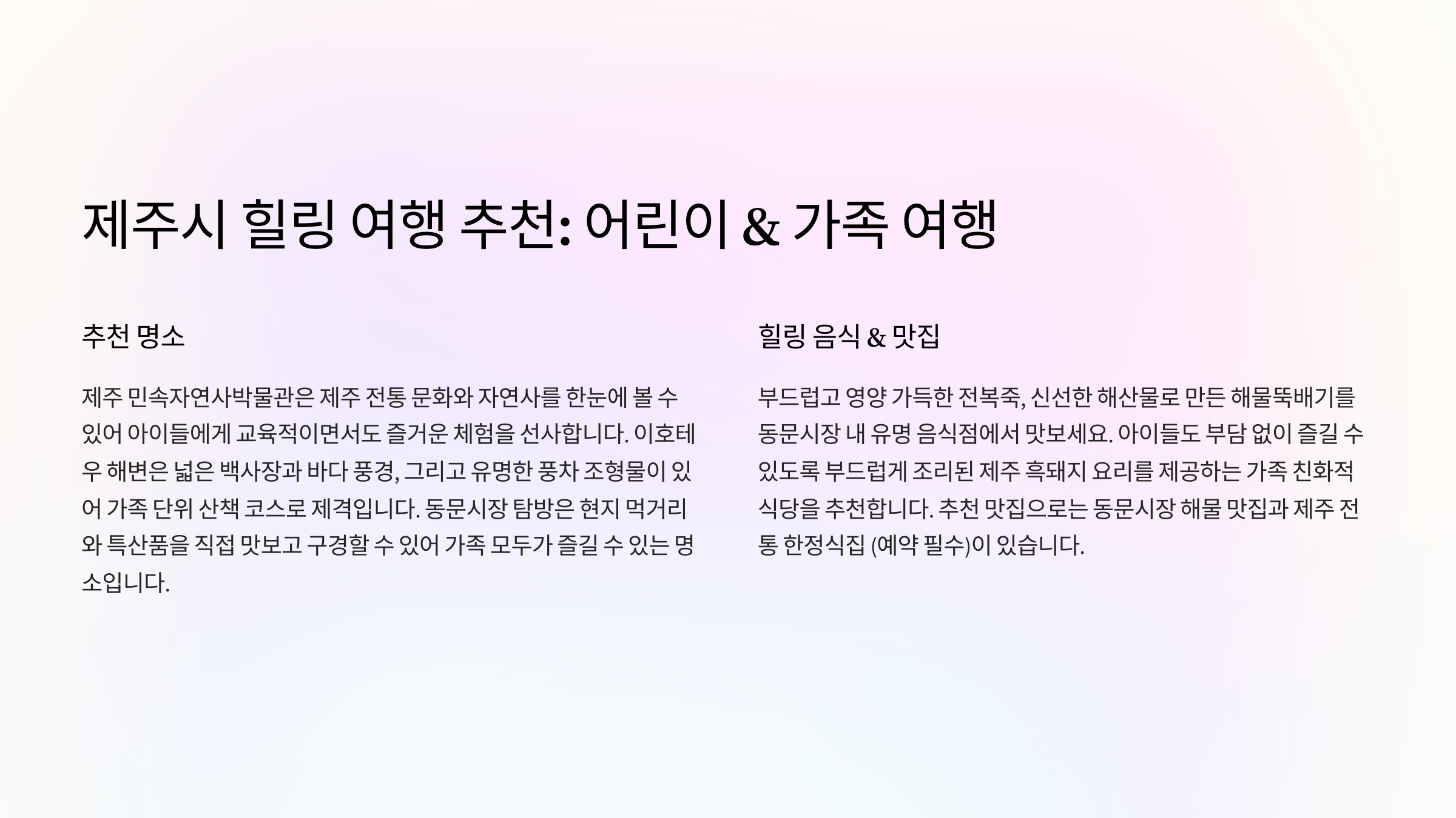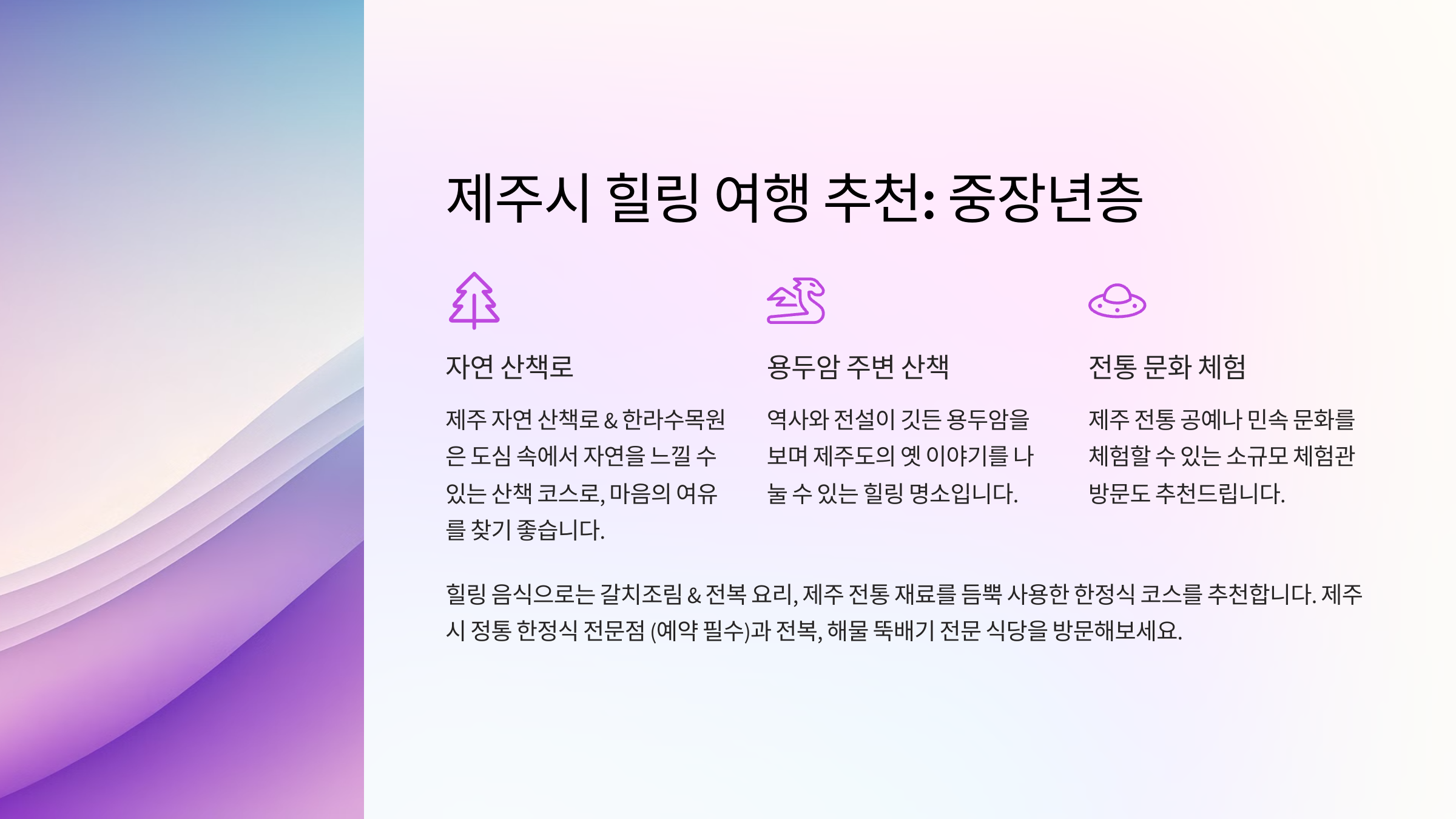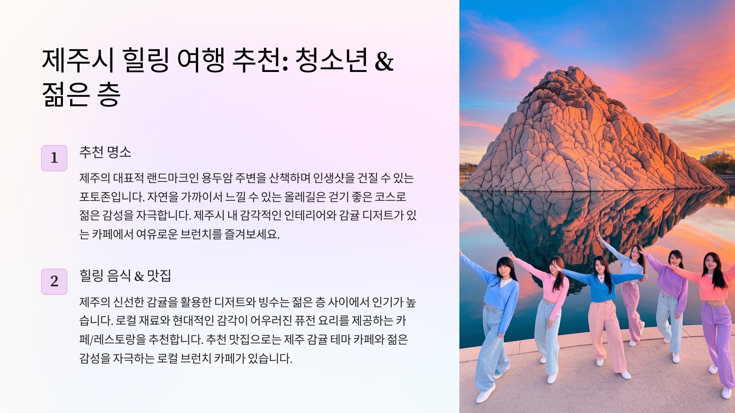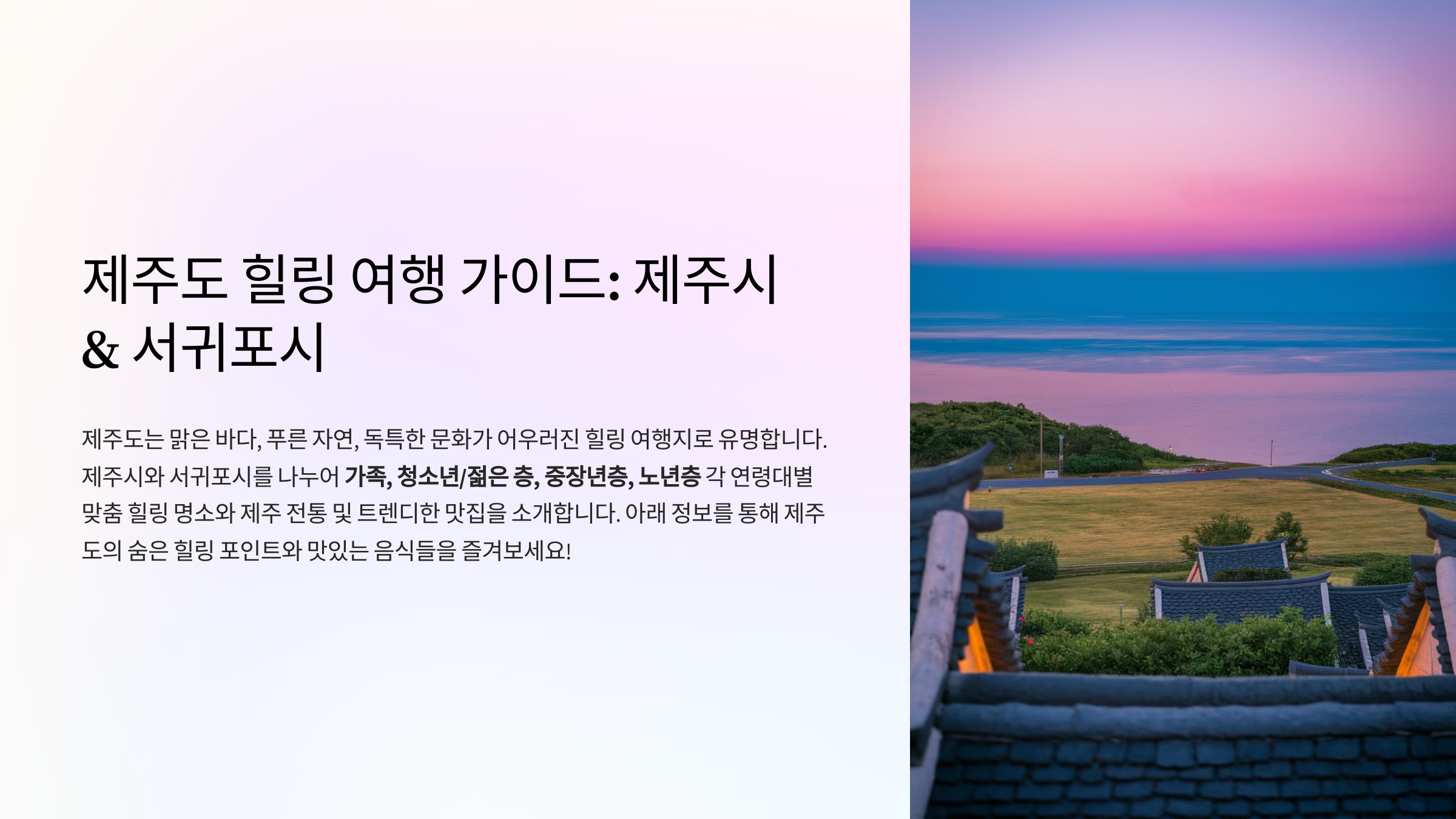 제주시와 서귀포시를 나누어 가족, 청소년/젊은 층, 중장년층, 노년층 각 연령대별 맞춤 힐링 명소와 제주 전통 및 트렌디한 맛집을 소개합니다.