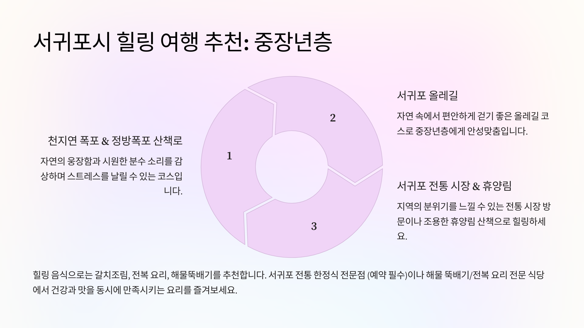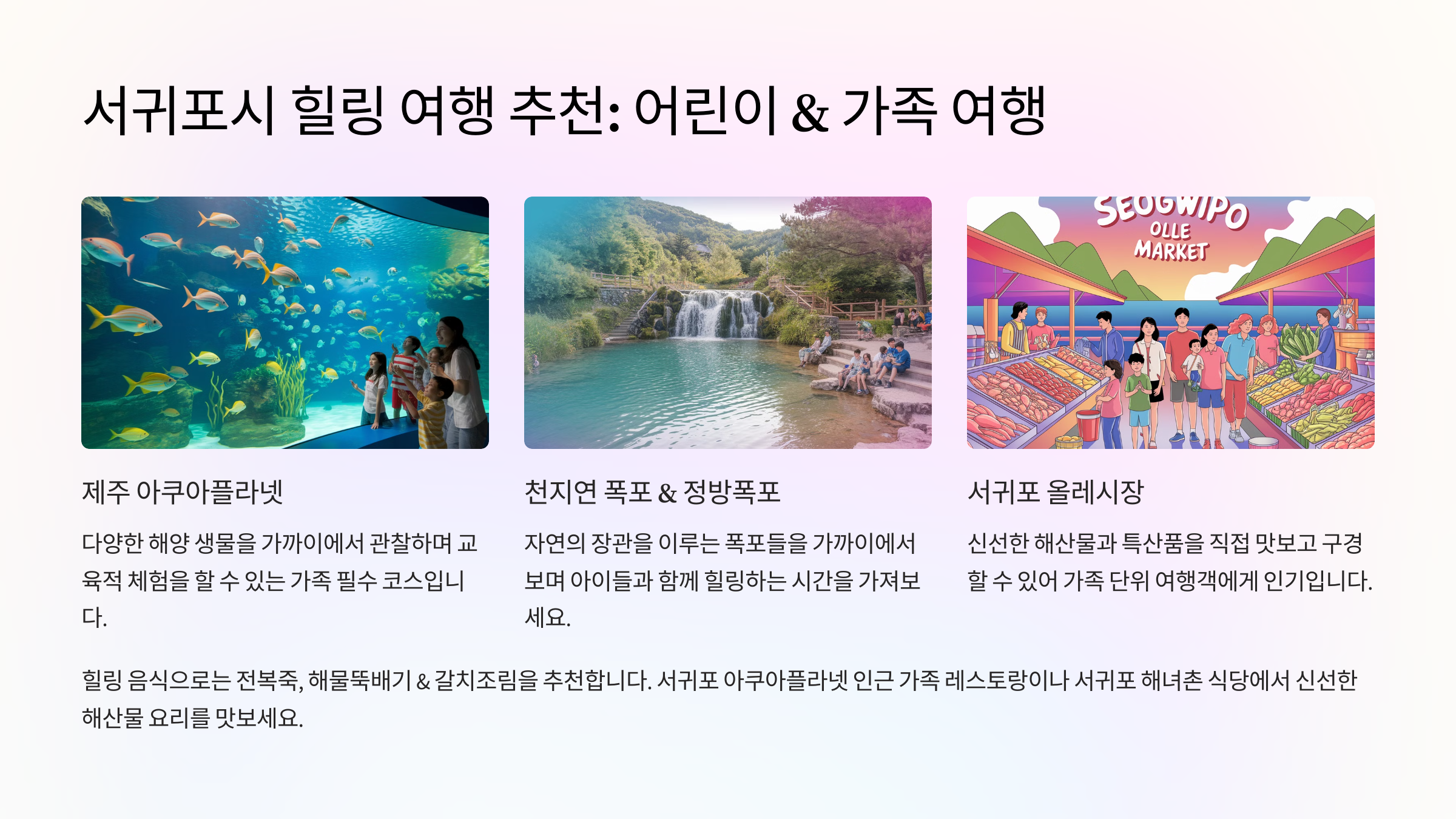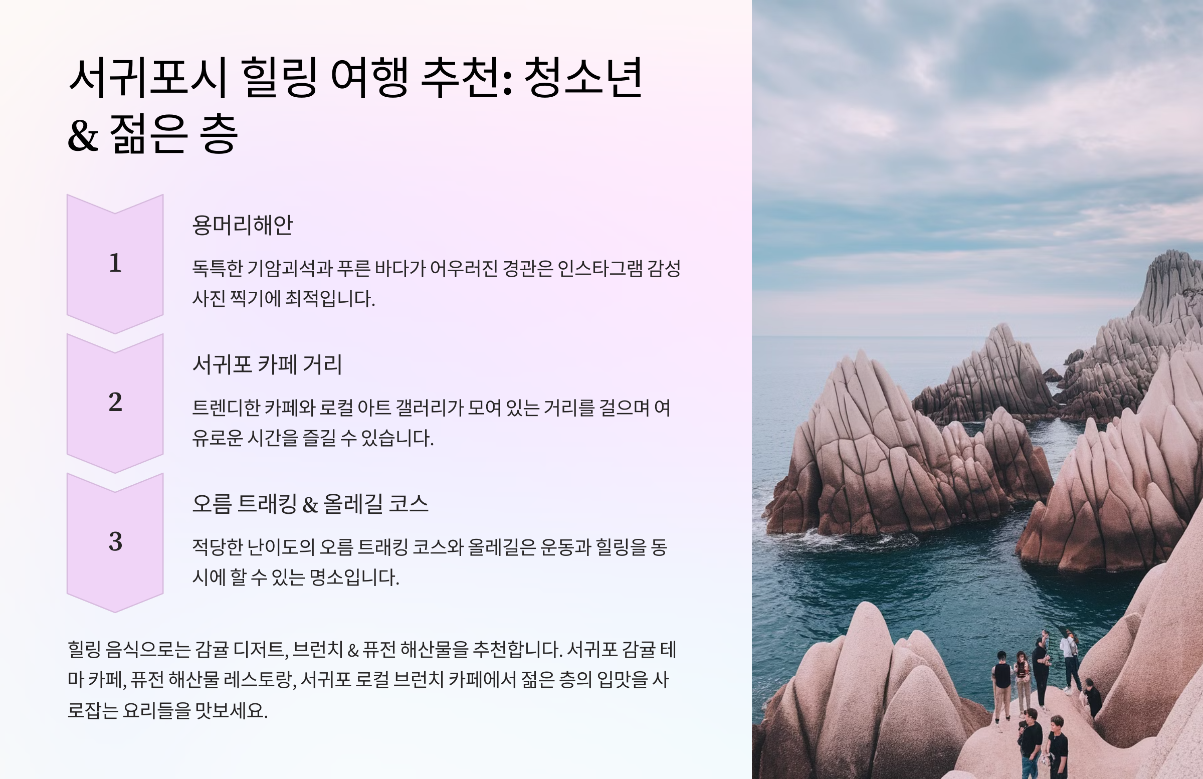 - 서귀포시는 제주 아쿠아플라넷, 폭포, 올레길, 해녀촌 등 자연과 해양을 가까이에서 느낄 수 있어 가족 단위 및 청소년/젊은 층에 인기가 많습니다.