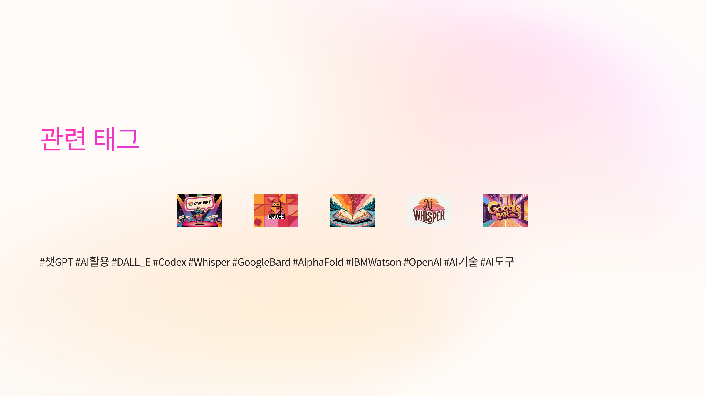 #챗GPT #AI활용 #DALL_E #Codex #Whisper #GoogleBard #AlphaFold #IBMWatson #OpenAI #AI기술 #AI도구