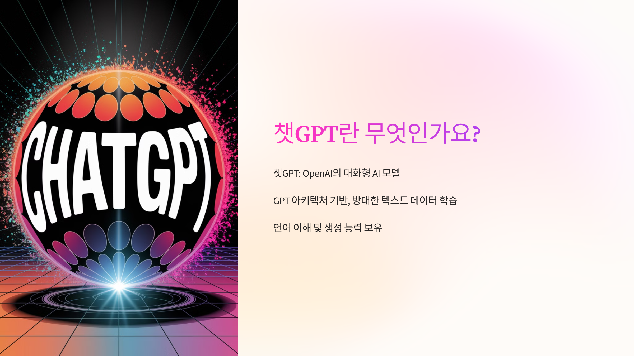 챗GPT(ChatGPT)는 OpenAI에서 개발한 대화형 인공지능(AI) 모델로, 사람과 자연스럽게 대화를 나누며 정보를 제공하거나 다양한 작업을 지원할 수 있는 언어 모델입니다. 챗GPT는 GPT(Generative Pre-trained Transformer) 아키텍처를 기반으로 하며, 방대한 텍스트 데이터를 학습해 언어를 이해하고 생성할 수 있는 능력을 갖추고 있습니다.