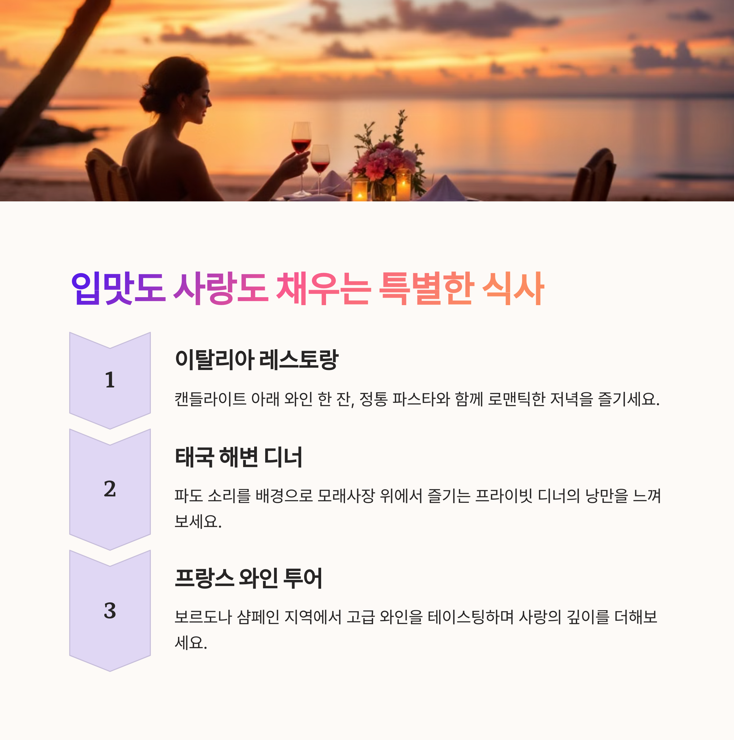 여행지에서 맛있는 음식도 중요한 요소입니다. 이탈리아의 **로맨틱한 레스토랑**, 태국의 **해변가 디너**, 프랑스의 **와인과 함께하는 저녁 식사** 등 분위기 좋은 곳에서 함께하는 한 끼는 잊지 못할 추억을 만들어 줍니다.