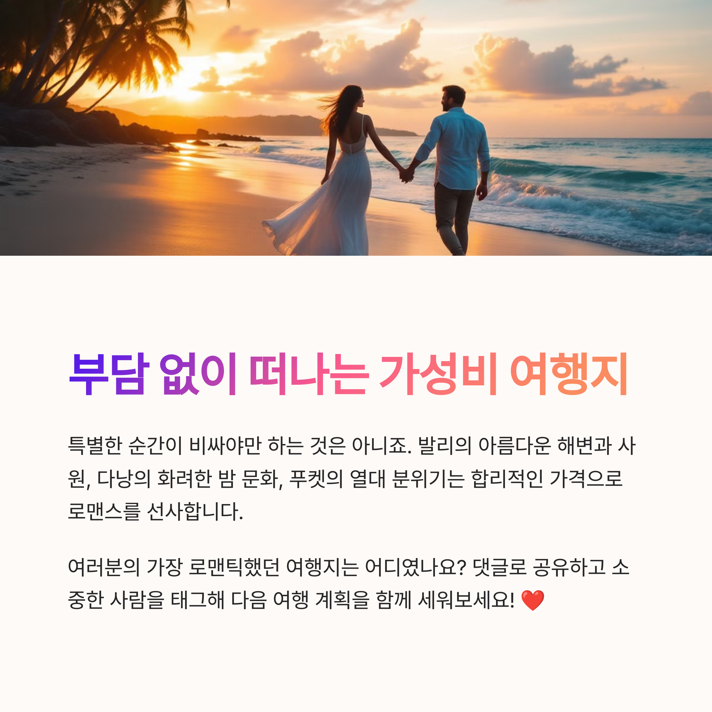 사랑하는 사람과 함께하는 여행은 더욱 특별한 순간을 만들어 줍니다. 아름다운 풍경 속에서 둘만의 시간을 보내며, 로맨틱한 추억을 만들어 보세요. 이번 여행이 더욱 소중한 시간이 되길 바랍니다!