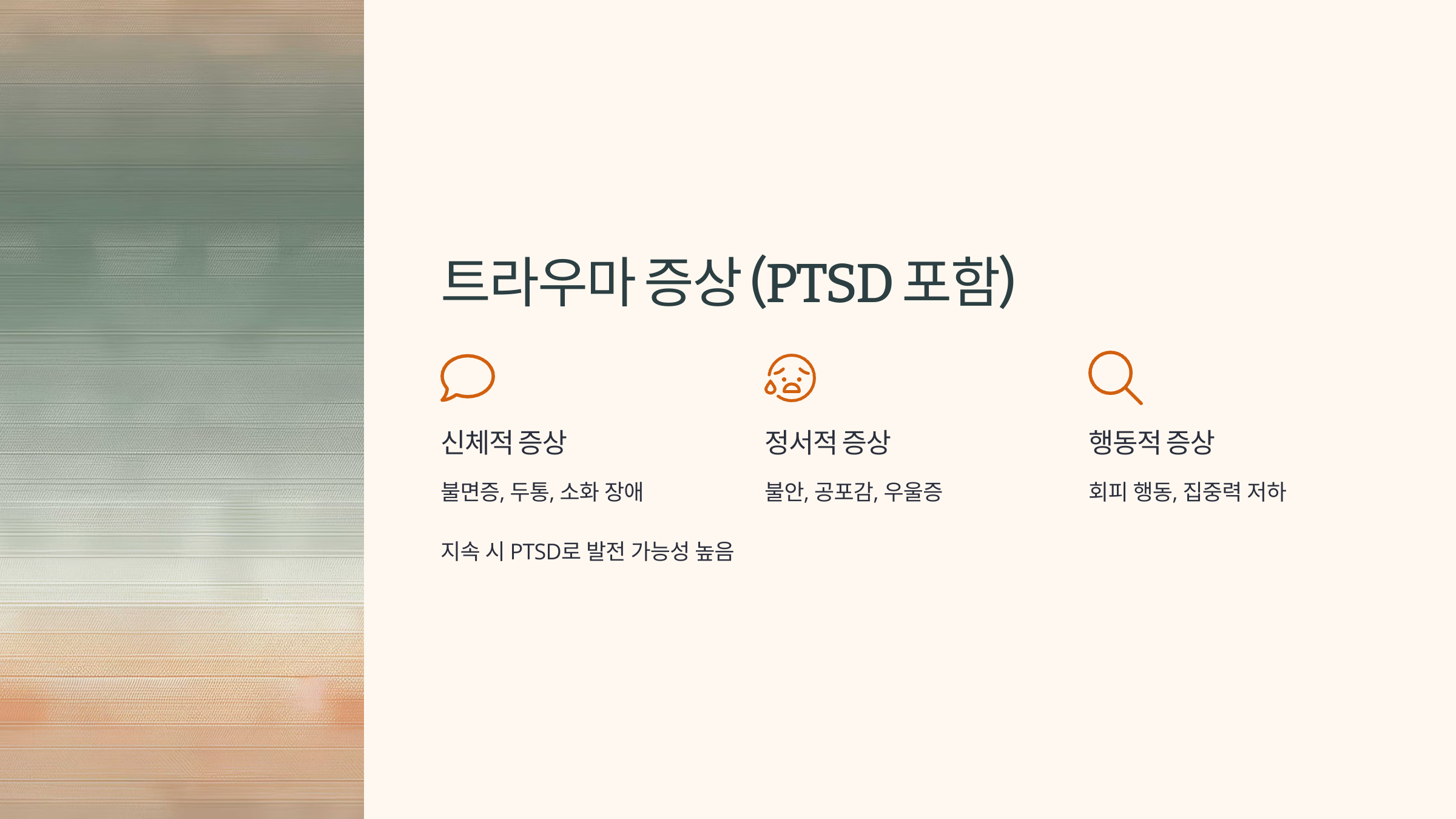 💡 주의: 지속되면 PTSD(외상 후 스트레스 장애)로 발전할 가능성이 높음.