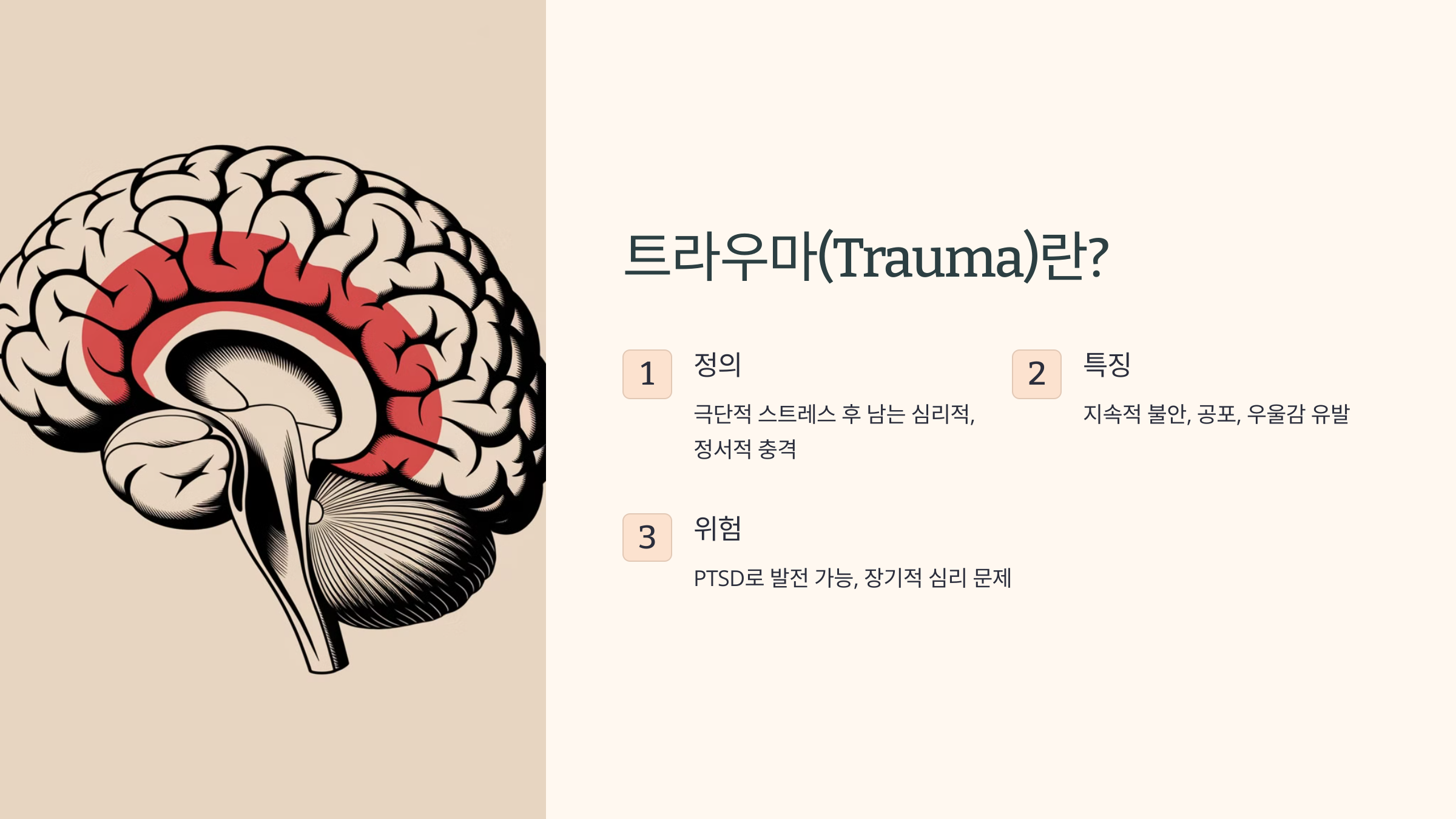 트라우마(Trauma)는 극단적인 스트레스 상황을 경험한 후 남는 심리적, 정서적 충격을 의미합니다. 심각한 사건을 경험하면, 뇌는 이를 제대로 처리하지 못하고 강한 감정과 기억이 반복적으로 떠오르게 됩니다.