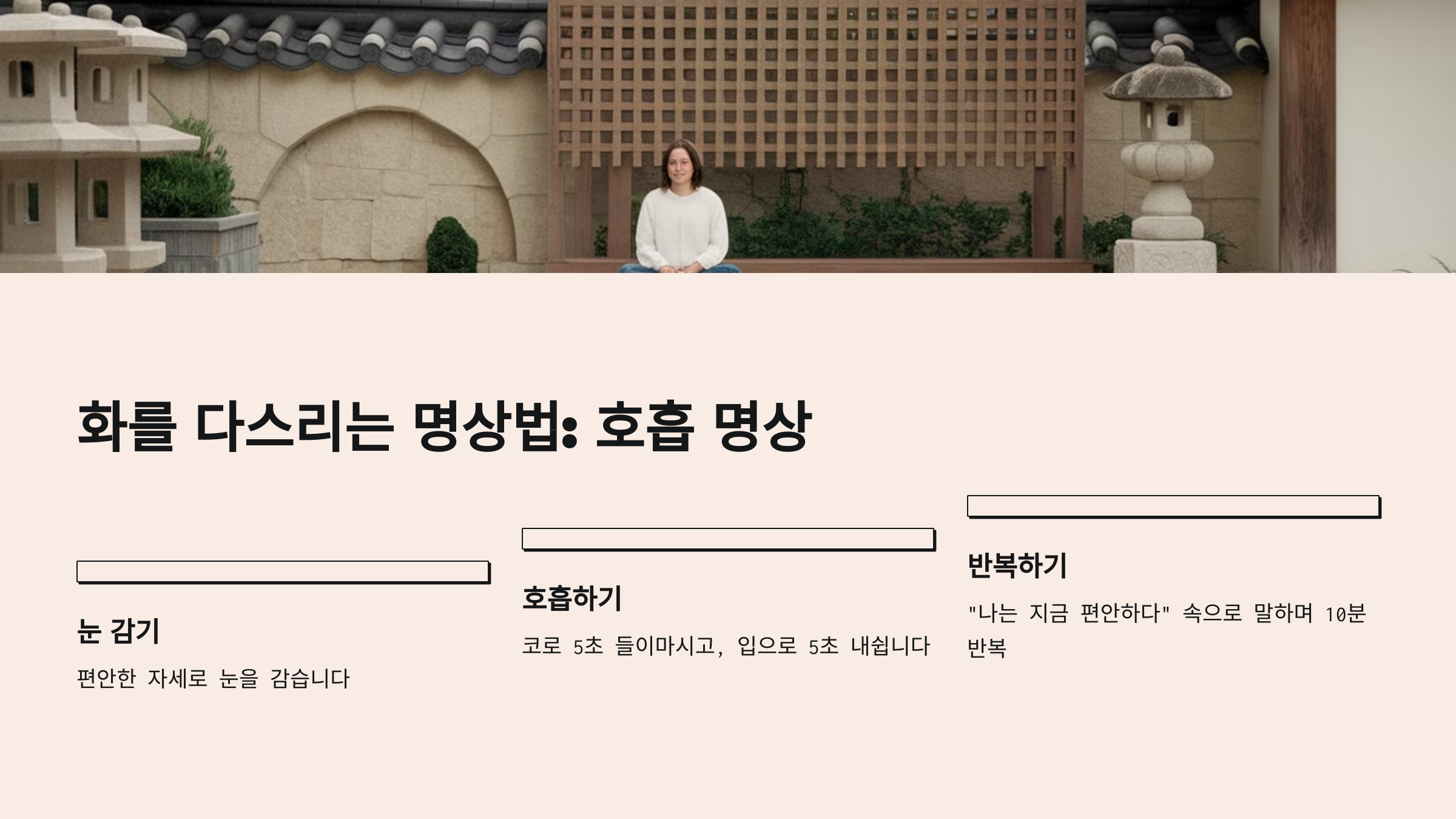 1. 눈을 감고 코로 천천히 숨을 들이마시고(5초), 입으로 내쉰다(5초).